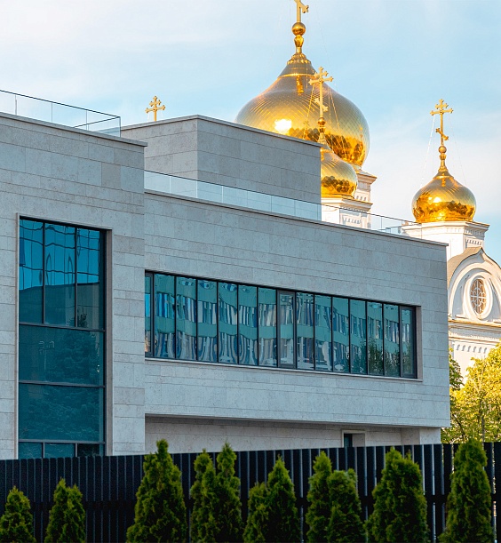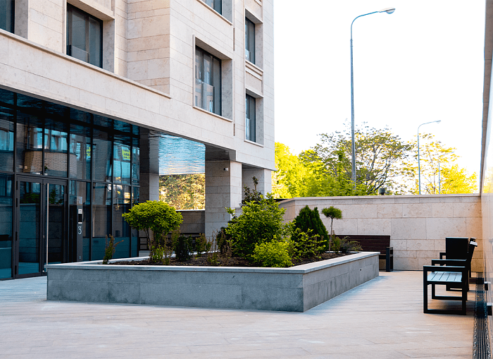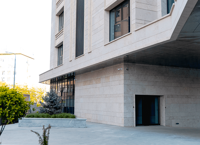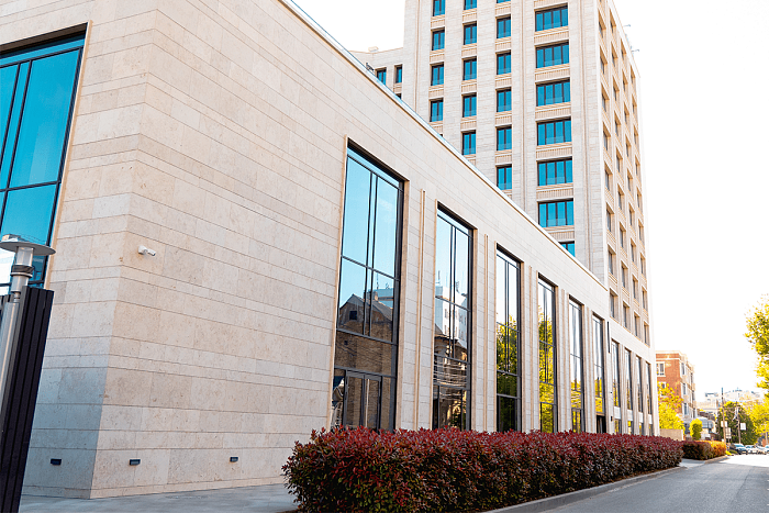Фасады выполнены из юрского мрамора — натурального камня, который формируется более 150 млн. лет и добывается только в одном месте в мире, в Германии (завод Franken-Schotter). Он очень красив, его особенность, помимо долговечности — это высокое содержание органических окаменелостей — древних моллюсков на каждой плите.